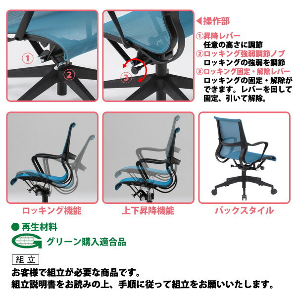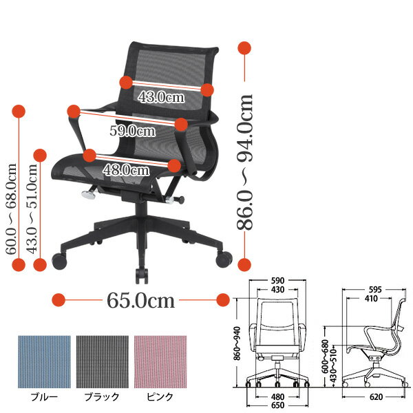 ■サイズ横幅(W)x奥行(D)X高さ(H) mm 650×620×860〜940 ■共通仕様 ●背・座部:強化樹脂成型品・メッシュ ●肘部:強化樹脂成型肘 ●脚部:強化樹脂成型品5本脚・ガスシリンダー・Φ60ナイロン双輪キャスター ●再生材料 ●グリーン購入適合品 ●重量:11.0kg ●梱包:1脚入 ■カラー ブルー/ブラック/ピンク ■組立について 宅配便での発送 お客様による組立 ■納期について おおよその納期は、約5〜7日後の発送予定となります。